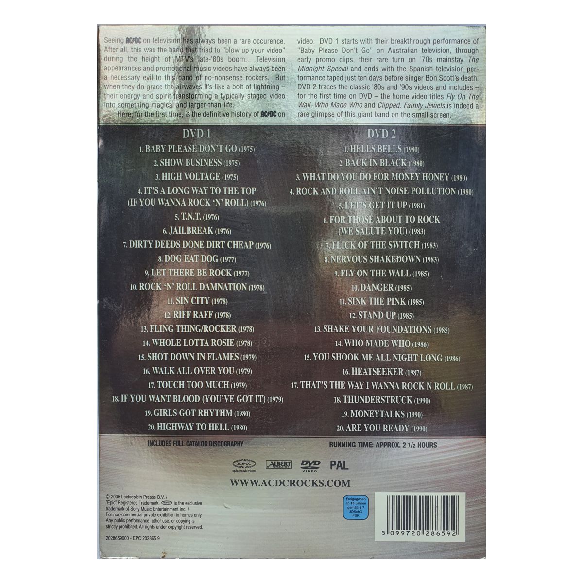 Each disc contains 20 videos. Disc 1 covers the Bon Scott era and disc 2 the Brian Johnson years.